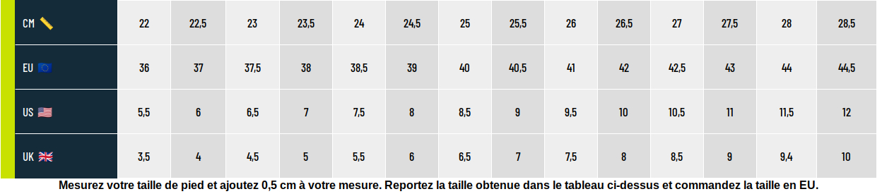 Su suela de caucho ultra resistente garantiza un agarre eficaz en todo tipo de superficies. Sus tacos de 3.5 mm aseguran una excelente tracción en superficies embarradas, mientras que sus refuerzos de caucho garantizan una gran durabilidad kilómetro tras kilómetro.